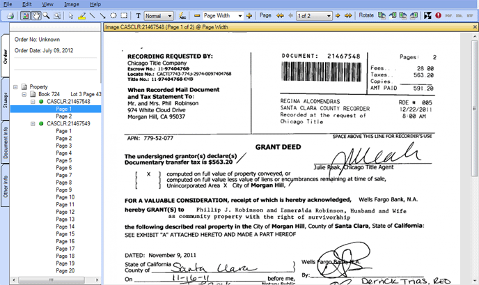 The Order Tab contains general information about the order, such as order number and the date the order was created. It also displays a hierarchical folder/file structure of the order's images, and their associated Image Statuses, which closely emulates TitlePoint's Recent Activity. Clicking these line-item images displays them in the right pane, if available.