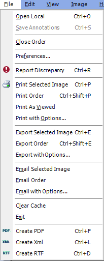 The Menu Bar includes a set of menu titles. Each menu title displays a drop-down menu comprised of a collection of menu items, or choices. Below are screen shots of each menu title and its components. Click on portions of the menus to review further information about those portions.