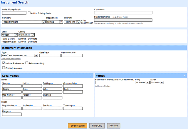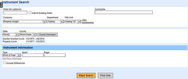 How the Instrument Search page displays depends on the county in which it is searched. Below are links to two examples. Click page portions to review further information about those items.