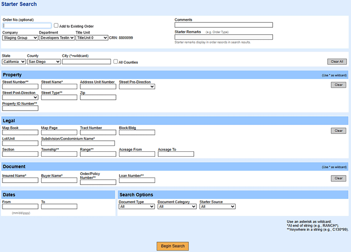 Below is a Starter Search screen example. Click on portions of the page to review further information about those items.