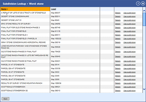 Use subdivision auto-populates the major legal portion of the subdivision in the Legal Description search fields on the Combination and Property Search pages, so you need only type the minor legal portions to search.